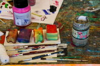 Anfangs ließ er viel Freiheit beim Ausprobieren verschiedenster Techniken: tuschen, kreiden, zeichnen, malen, tupfen, pinseln, kleben, spachteln, kratzen. So kamen Acrylfarbe, Tinte und Tusche, unterschiedliche Pinsel, Rollen, Schwämme, Kreppband und Spachtel zum Einsatz.