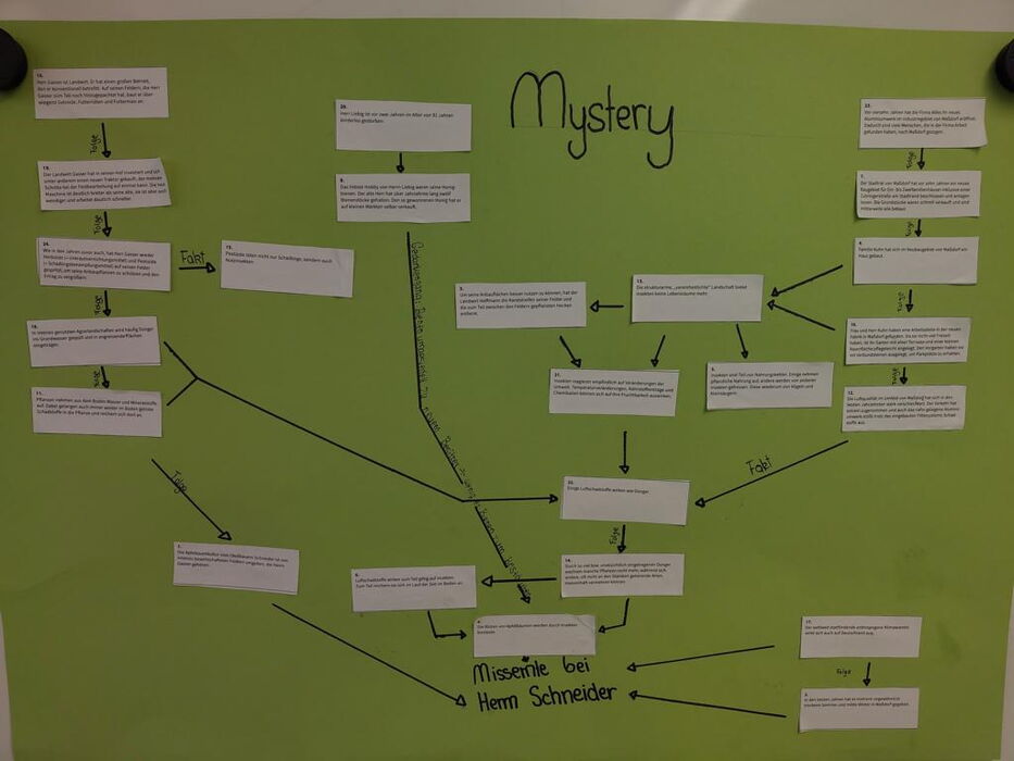 Was haben eine Aluminiumfabrik, Steingärten und der Tod eines Imkers mit einer misslungenen Ernte eines Obstbauers zu tun? Die Schülerinnen und Schüler der 8e sind dieser mysteriösen Frage im Biologieunterricht mithilfe eines Wirkungsgefüges nachgegangen. Dabei wurdeideutlich, wie menschliches Handeln ökologische Zusammenhänge beeinflusst – oft mit weitreichenden Folgen.