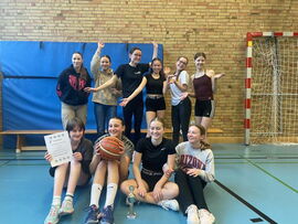 Das Mädchenfinale der Basketballturniers der 9. Klassen war an Dramatik kaum zu überbieten: Nachdem die Führung in einer ausgeglichenen Partie ständig wechselte, stand es nach Ende der regulären Spielzeit 6:6-Unentschieden, so dass der erste Korb in der Verlängerung die Entscheidung bringen musste. Aufgrund eines Foulspiels gab es schließlich zwei Freiwürfe für die 9d: Vicky trat an und verfehlte den ersten Versuch knapp. Der zweite jedoch fiel durch den Ring. Aus! Sieg für die 9d im Finale gegen die 9c, welche das Aufeinandertreffen in der Vorrunde noch für sich entscheiden konnte.
