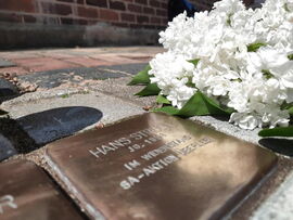 Um gemein­sam diese wichtige Erin­nerungskultur zu pflegen, mach­ten wir uns - ausge­rüstet mit den Reinigungs­materia­lien Was­ser, Schwämmen, Lap­pen und Putz­mittel - auf den Weg zu den ver­schiedenen Stand­orten der Stolper­steine. Während wir die kleinen, aus Mes­sing be­stehen­den Steine mit den Namen, Geburts­daten und den Schicksa­len der Menschen putz­ten, wurde uns erneut be­wusst, wie wichtig es ist, die Ge­schichte lebendig zu halten und den Op­fern einen respekt­vollen Ort des Ge­denkens zu bieten.